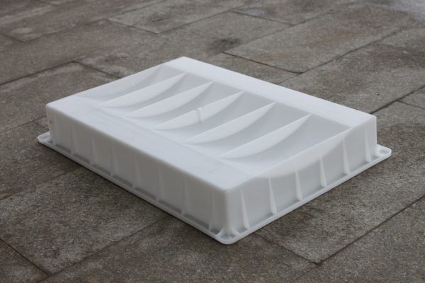 其中,流水石蓋板模具多加強筋設(shè)計,在模具全框架邊布置小型高密度加強筋,在流水石蓋板模具底部則布置大型月牙型加強筋,可以有效的保證在預(yù)制水泥流水石蓋板過程中,模具和水泥成品均不會變形。