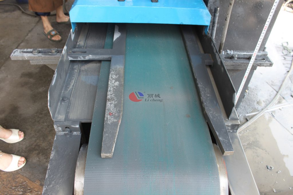制作這臺多功能成型機(jī)的技術(shù)員在對這臺機(jī)器出廠前進(jìn)行了最后一步的調(diào)試,將澆筑成型的水泥磚放置輸送帶上,成型機(jī)入口處與出口處都有配置供水系統(tǒng),防止在制作過程中塵土飛揚(yáng),能對水泥制品打磨過程中其表面更為整潔統(tǒng)一。經(jīng)過平磨系統(tǒng)對水泥模具澆筑成型的水泥制品進(jìn)行磨形,后進(jìn)入第二系統(tǒng)對水泥磚塊制品就進(jìn)行拉條紋,這款多功能側(cè)石二工位條紋成型機(jī)打磨成型的條紋彩磚的外觀以34條紋為主。打磨成型后在有輸送帶將水泥磚運(yùn)輸出來。其使用過程中為防止施工過程中的安全事故的發(fā)生,通過使用電控箱的方式來對機(jī)器進(jìn)行急??刂?。