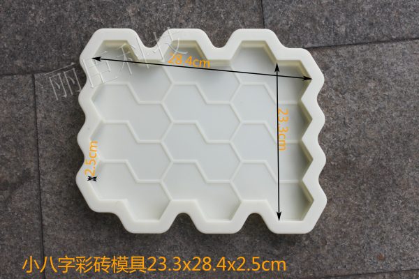 這款小八字彩磚塑料模具外觀上呈現(xiàn)出不規(guī)則形狀,遠(yuǎn)處看過去外觀有些像蜂巢的樣式,彩磚模具的規(guī)格為28.4×23.3×2.5,彩磚塑料模盒在制作過程中采用全新的ABS為主要生產(chǎn)原料,至成型后的彩磚塑料模具外觀整體呈現(xiàn)一種淡鵝黃色,其模具表面能有明顯的光澤感,下面這張圖是小八字彩磚模具澆筑成型后的模型款式。