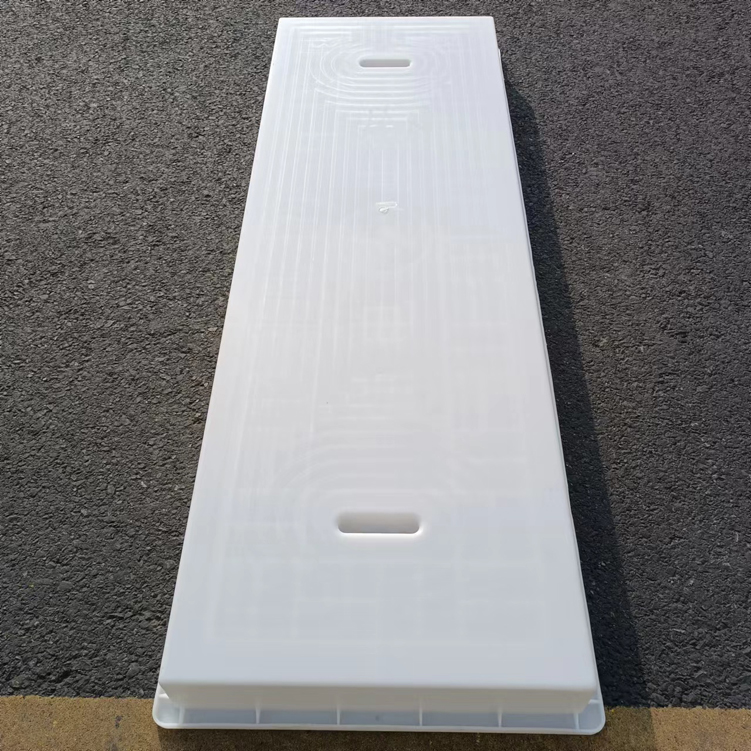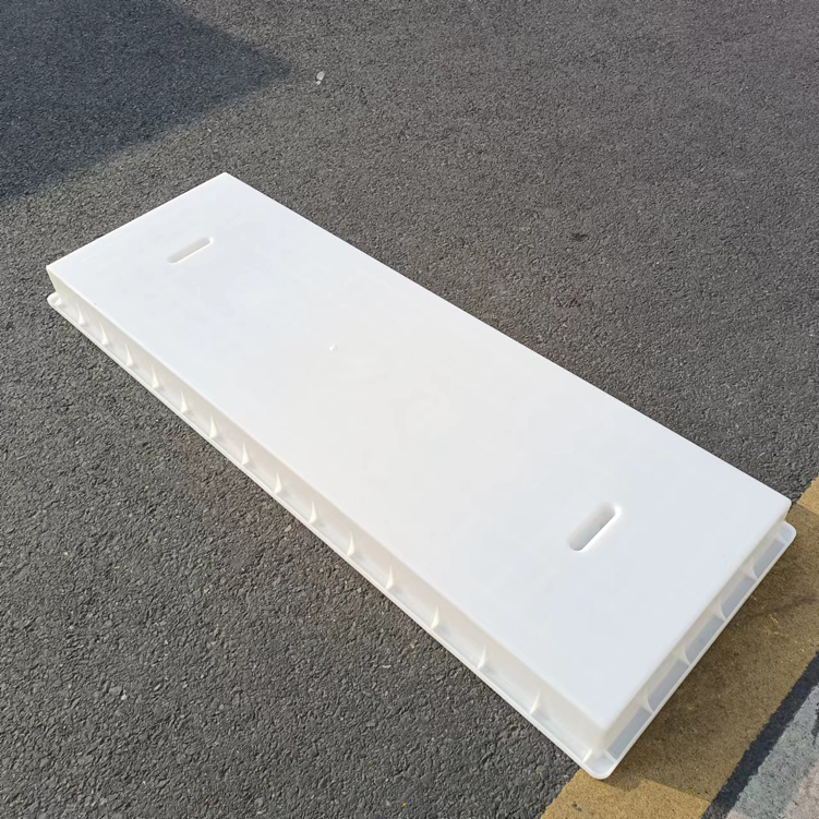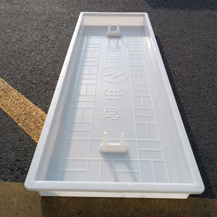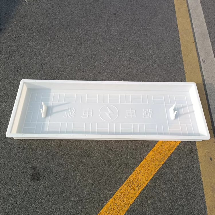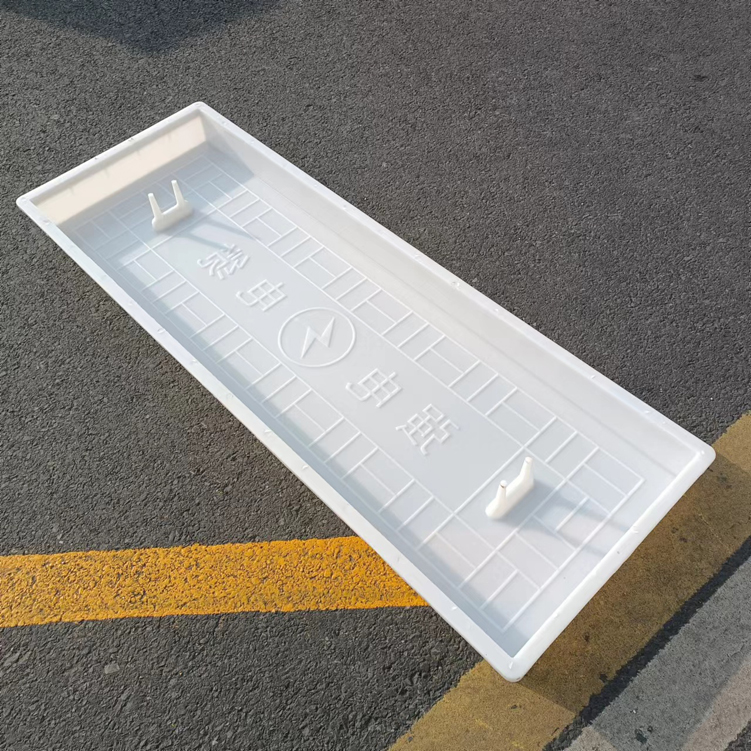 這款蓋板整體采用米白色pp材質(zhì)制成、也可以使用ABS材質(zhì)制成都可,模具有戴預(yù)埋件和不帶預(yù)埋件兩種,且做ABS材質(zhì)的模具標準尺寸為150cm*50cm*10cm,ABS材質(zhì)模具質(zhì)量比做PP材質(zhì)模具好一些,做PP材質(zhì)模具尺寸會縮小一些,主要由于材料的性質(zhì)不同,會縮小尺寸為千分之九。蓋板中間有戴電力標志,兩側(cè)帶字,帶有“電力電纜”四字。