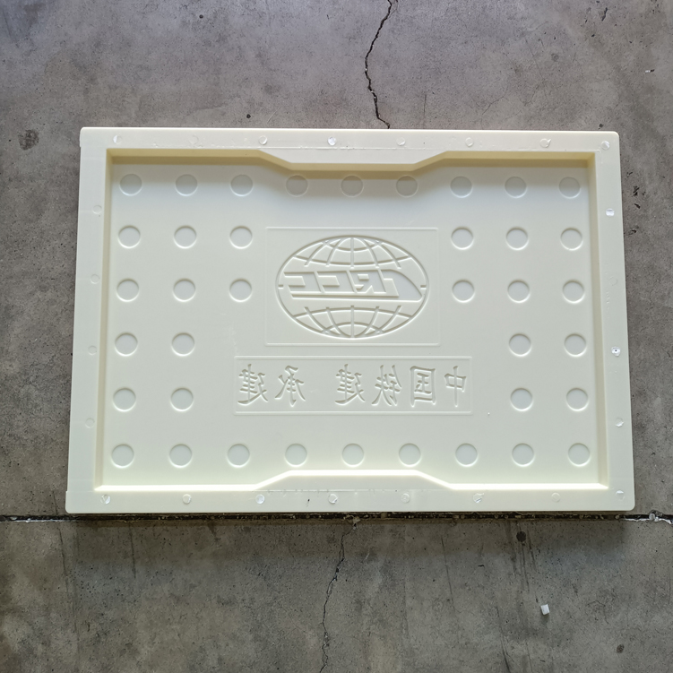 模具較薄,主要用于rpc材質(zhì)預(yù)制制作,花紋為缺口圓點(diǎn),中間帶有中鐵圖標(biāo),底部設(shè)有中國鐵建 承建字樣,為中鐵專用模具。